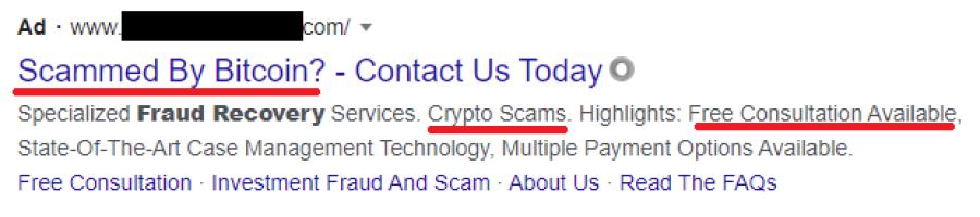Despite it being quite clear that cryptocurrency transactions are irreversible, there are plenty of companies confidently boasting that they can help victims of scams recover their cryptocurrency. All of them follow the same patterns. Firstly, they heavily promote their services through mediums such as search engines: