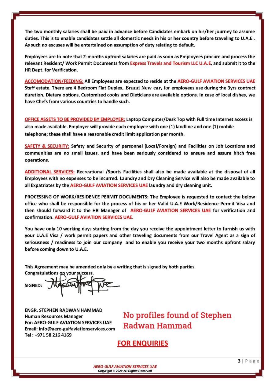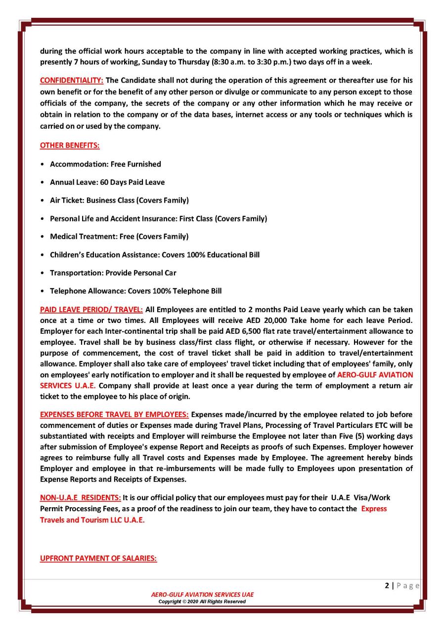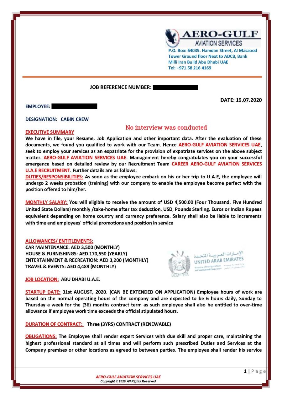 Vous trouverez ci-dessous un exemple réel d'arnaque à l'emploi de Cabin Crew. Nous avons reçu cette demande sur notre page Facebook, nous demandant de vérifier si l'offre d'emploi était authentique. L'emploi était proposé par une société appelée AeroGulf Aviation Services, basée à Abu Dhabi, pour rejoindre le personnel de cabine.