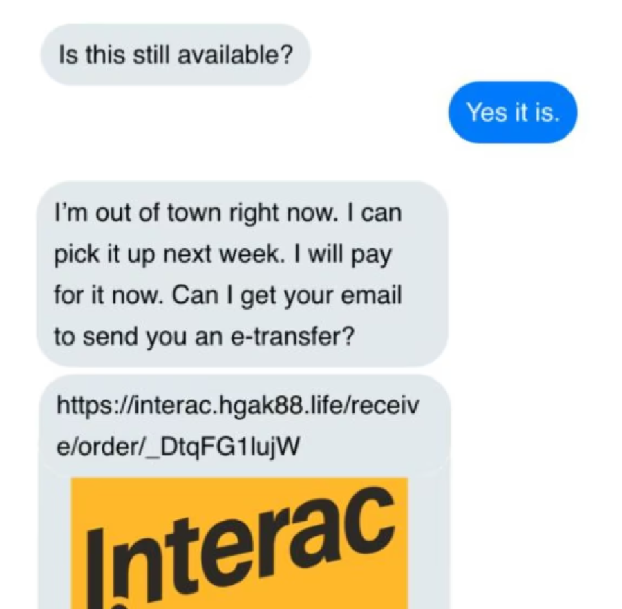 One sneaky scam involves fraudsters posing as buyers who say, “I’ll pay now and pick up later.” They send an Interac notice that prompts a text authorizing the deposit into your account. But instead of sending money, the text authorizes them to withdraw money from your account. Sneaky, right? If this happens, contact your bank immediately to reverse the transaction.