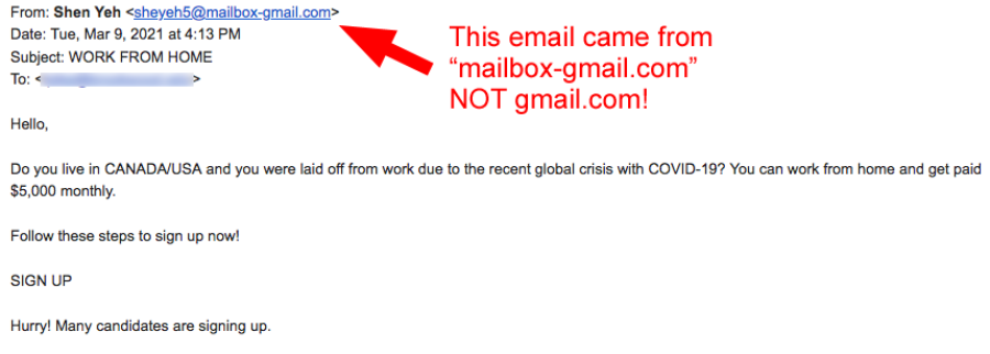 How can we make such an egregious claim that this wealthy non-profit cares more about profit than internet safety? Let’s start with a very simple scam email containing the subject line “WORK FROM HOME.” (A TDS reader sent this to us without a working link connected to “SIGN UP.”) This email came from someone identified as Shen Yeh through the domain mailbox-gmail[.]com. This is such an OBVIOUS fraudulent effort to look like an email from Gmail. But this domain doesn’t belong to Google (the owner of Gmail.) This domain was first registered anonymously about 5 years ago, lapsed in use, and was then re-registered late last October, 2020. By contrast, gmail.com was registered more than 25 years ago by Google.