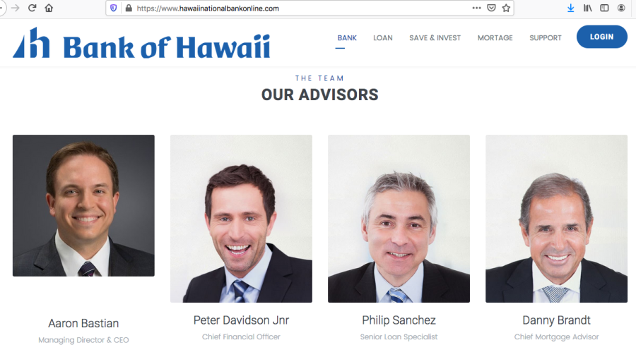 Based on these oddities, we conducted an image search for one of the “Team Advisors” of HawaiiNationalBankOnline.com, and shown in this screenshot as Peter Davidson Jnr, Chief Financial Officer. This is where the insanity begins as we found ourselves at the precipice of a deep dark rabbit hole.