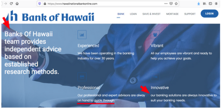 Errors in grammar and capitalization, such as “Banks Of Hawaii team provides independent advice based on established research methods.”