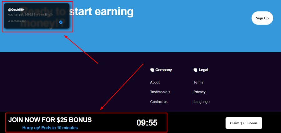 They also use pop-ups claiming that other users have “just been paid.” These types of messages are designed to create social proof and make you feel like everyone else is getting in on the action — another technique to rush you into making a hasty decision.