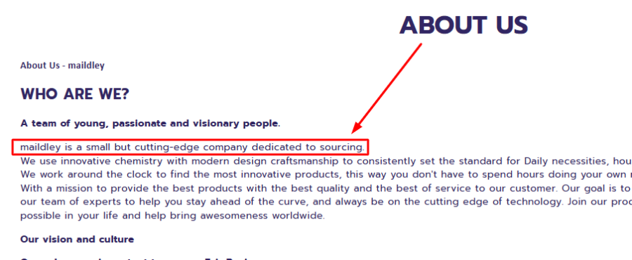 When I checked the About Us page on Maildley.com, I found this statement: “Maildley is a small but cutting-edge company dedicated to sourcing.” Sounds harmless, right? But here’s the catch—the exact same statement appears on numerous other websites like Viporama.com and Uniwiinc.com.