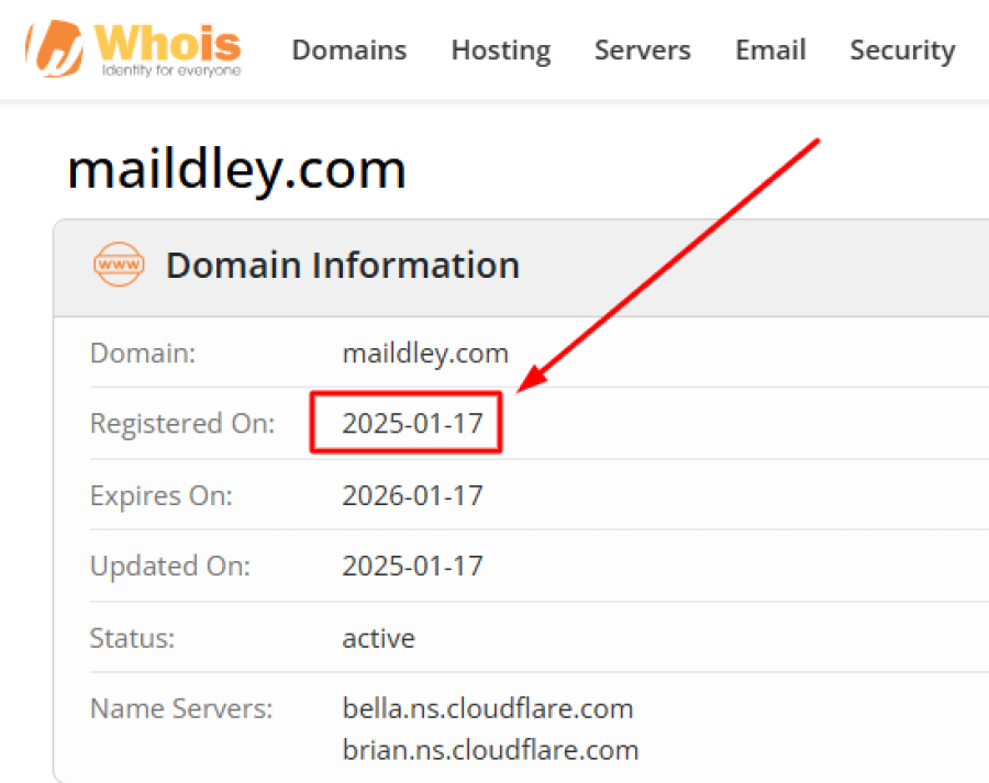 When I checked the domain history using Whois Lookup, I discovered that Maildley.com was registered in January 2025. While a new website doesn’t automatically mean it’s a scam, it does little to inspire confidence.