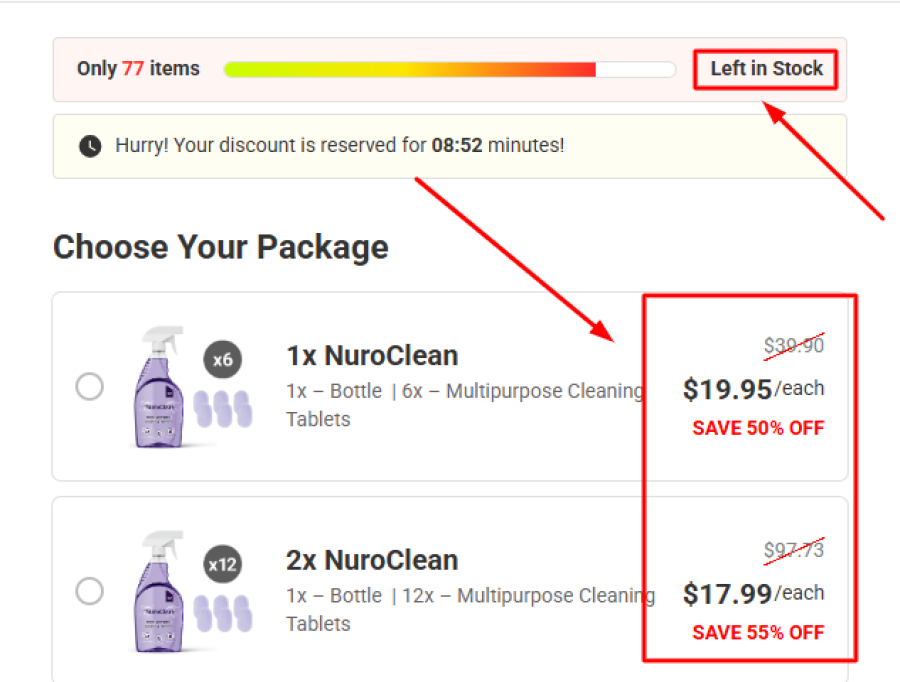 Beyond the deep discounts, Nuroclean.com employs high-pressure sales tactics to push customers into making quick purchases. A ticking countdown timer creates a sense of urgency, implying that the deals will disappear soon.