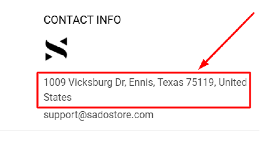 Sadostore.com lists its address as 1009 Vicksburg Dr, Ennis, Texas 75119, United States. However, this location is actually a residential area, not a business or warehouse. Out of curiosity, I looked up the address and found that it was just a house, not a legitimate storefront or distribution center.
