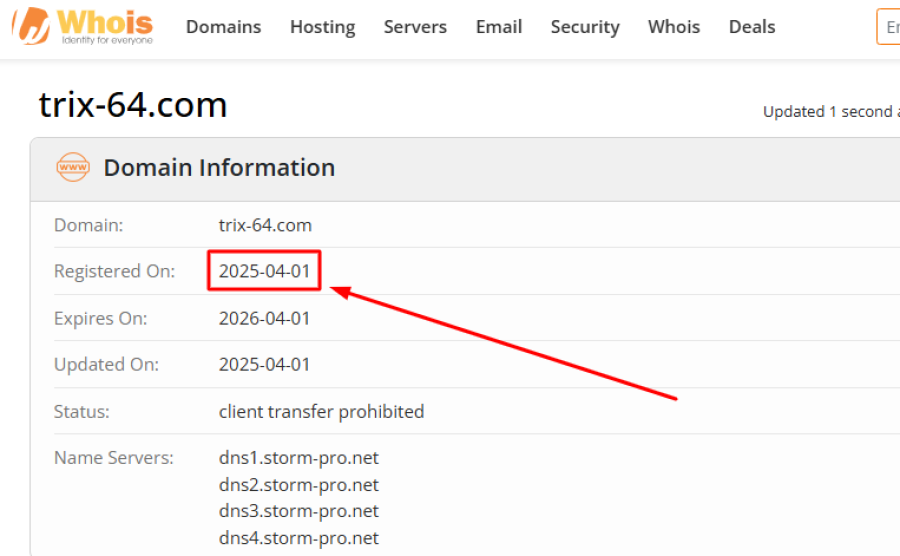 According to domain registration data from Whois and ScamAdviser, Trix-64.com was registered in April 2025. That makes it an extremely new website, which naturally raises some concerns. New gambling platforms tend to carry more risk, especially when there’s no real reputation, user feedback, or evidence of consistent payouts.