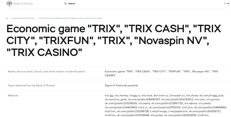 Perhaps the most alarming detail is the fact that the Bank of Russia has issued a public warning against Trix-64.com, Novaspin NV, and several other related entities. They state that signs detected by the Bank of Russia are signs of a financial pyramid.
