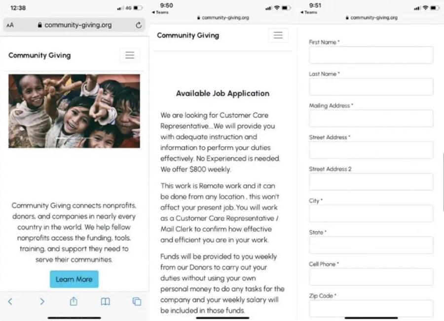 Here is how the scam unfolds. The URL in the bogus SMS leads to a fake Community Giving website. There, you are asked to fill out the online form to apply for the job: