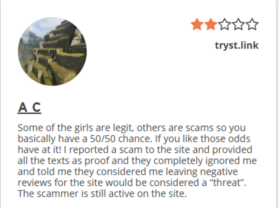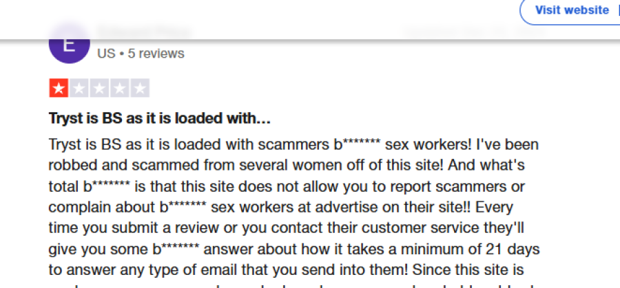But, there are also a lot of warning signs. Many users outside of Tryst.link's own website have had bad experiences with scams and poor customer service.